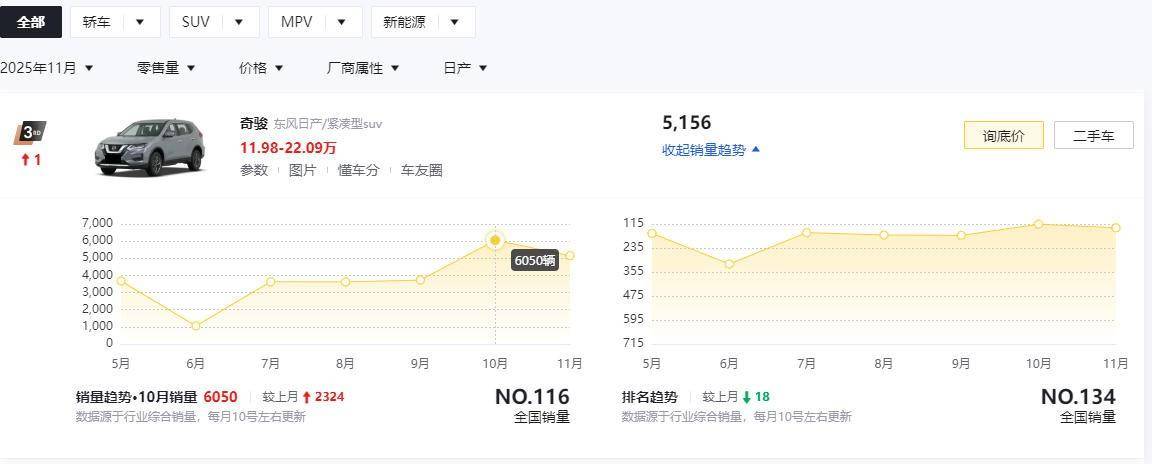 目前国内市场在售的现款奇骏大部分都是奇骏·荣誉车型,终端价格也已经来到了十二三万,主打的那叫一个量大管饱,能更好地照顾到那些对于大空间有需求的家用消费者。从销量上来看,奇骏在11月份卖出去了5156辆新车,属于是东风日产旗下第三热销的车型,整体表现还算尚可。