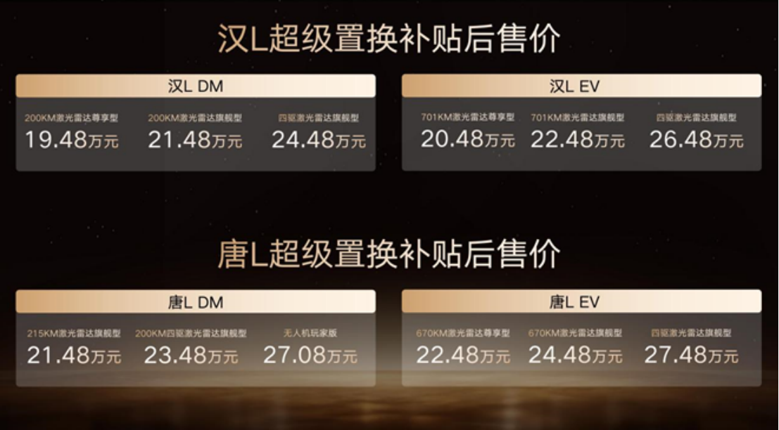 此次,汉L DM 3款车型,超级置换补贴后售价19.48万~24.48万元;汉L EV 3款车型,超级置换补贴后售价20.48万~26.48万元;唐L DM 3款车型,超级置换补贴后售价21.48万~27.08万元;唐L EV 3款车型,超级置换补贴后售价22.48万~27.48万元。
