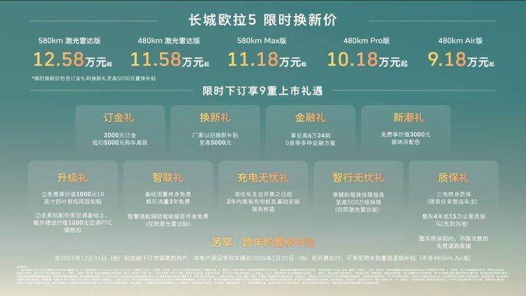 【中国·保定】2025年12月16日——今日,长城汽车欧拉品牌全新A级纯电SUV——长城欧拉5正式上市。新车共推出5款配置,建议零售价区间为 9.98万至13.38万元,限时换新价9.18万元起(限时换新价包含“订金礼”和“换新礼”至高5000元以旧换新补贴)。为回馈广大用户的热爱与支持,即日起至2025年12月31日,用户下订并锁单即可尊享包含订金礼、换新礼、智行无忧礼在内的9重上市好礼,以及跨年购置税补贴(不含480km Air版)等丰厚购车权益。凭借诚意十足的价格权益与越级产品力,长城欧拉5致力于成为全球年轻用户的“严选搭子”。