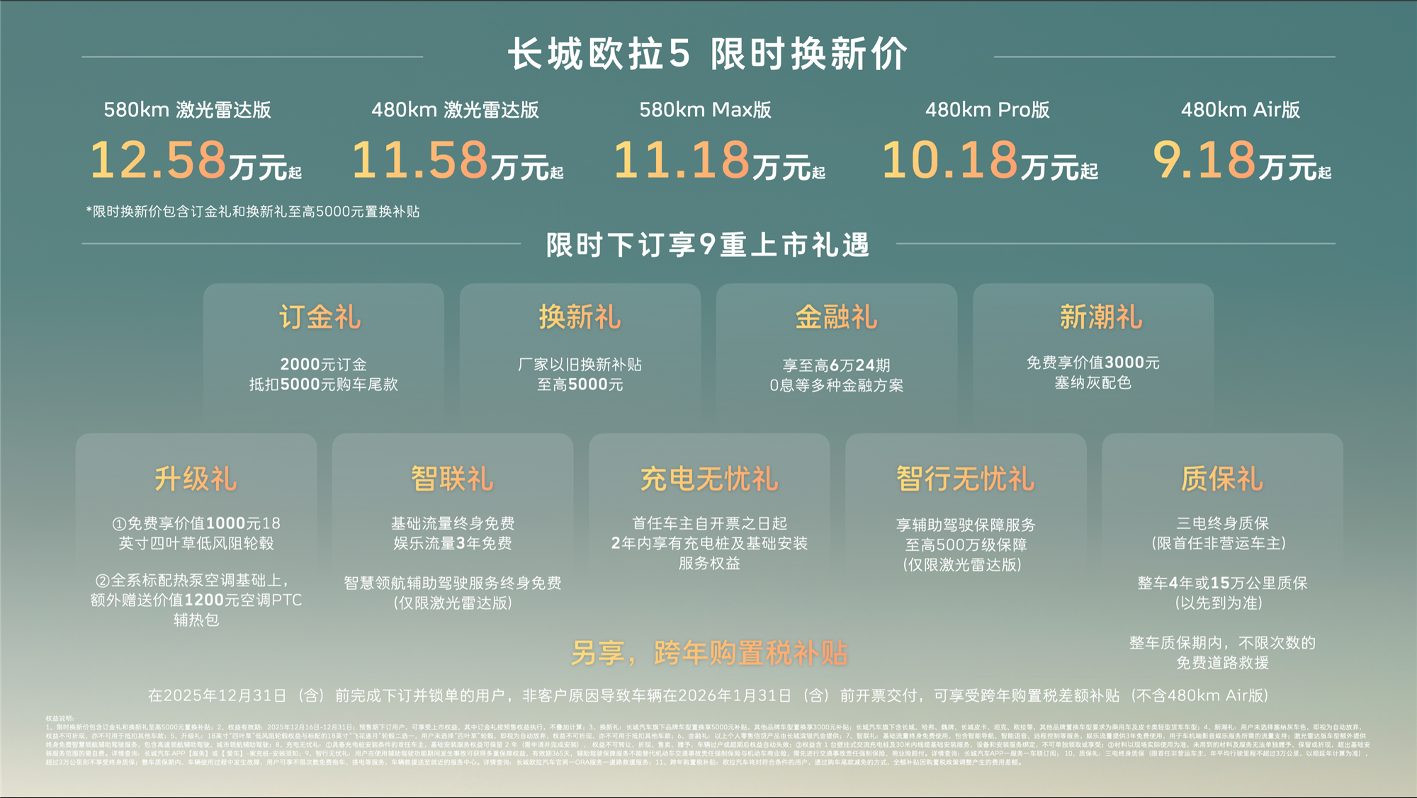 2025年12月16日,长城汽车旗下欧拉品牌的全新A级纯电SUV——欧拉5正式上市,建议零售价9.98万至13.38万元,限时换新价9.18万元起(限时换新价包含“订金礼”和“换新礼”至高5000元以旧换新补贴)。