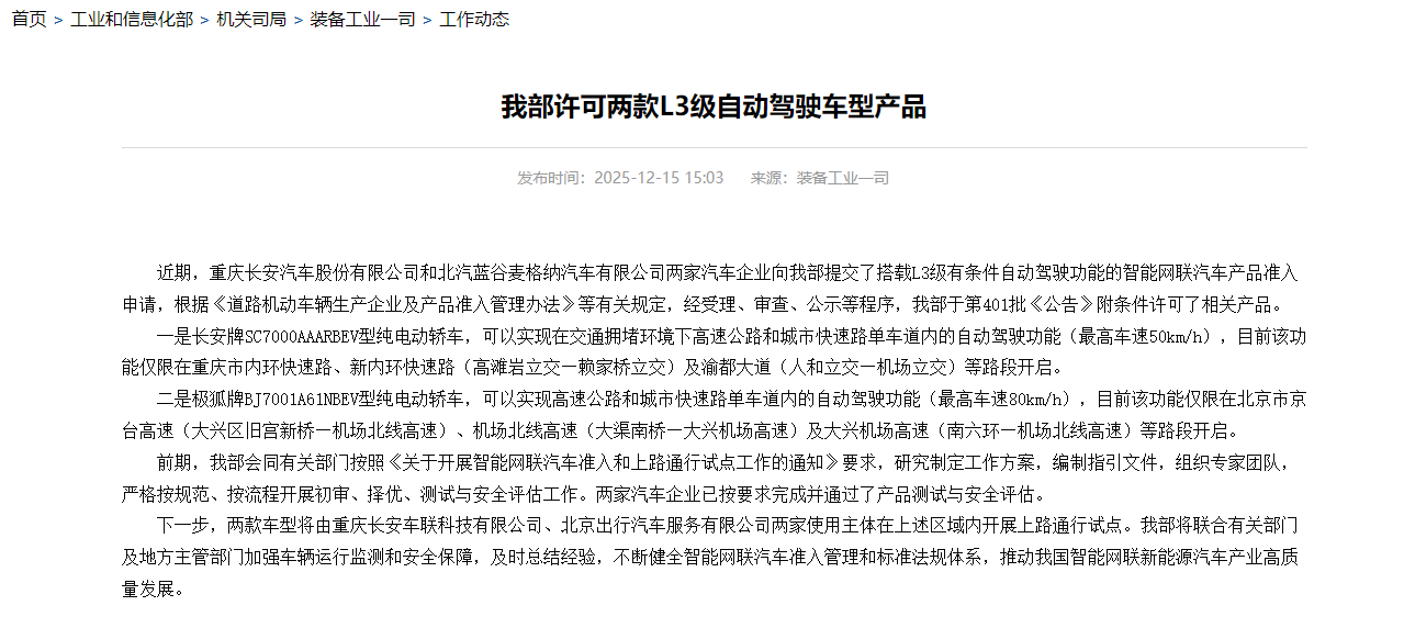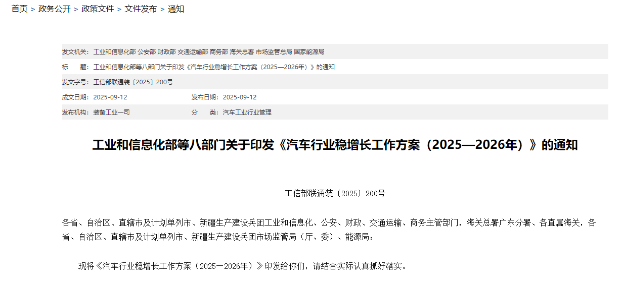 2025年9月,工信部等多部门联合印发《汽车行业稳增长工作方案(2025—2026年)》,明确提出推进智能网联汽车准入和上路通行试点,有条件批准L3级车型生产准入。