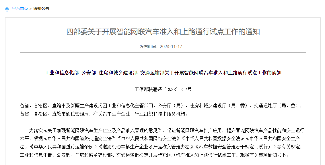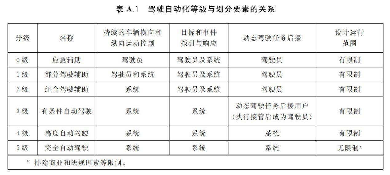 2023年11月18日,工信部发布《关于开展智能网联汽车准入和上路通行试点工作的通知》,明确参与试点的智能网联汽车搭载的自动驾驶功能是指国家标准《汽车驾驶自动化分级》(GB/T 40429-2021)定义的3级驾驶自动化(有条件自动驾驶)和4级驾驶自动化(高度自动驾驶)功能。