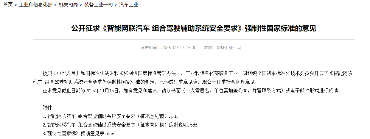 为此,2025年9月,工信部还牵头发布《智能网联汽车 组合驾驶辅助系统安全要求》(征求意见稿)强制性国家标准,对此前术语、功能定义等校正纠偏。
