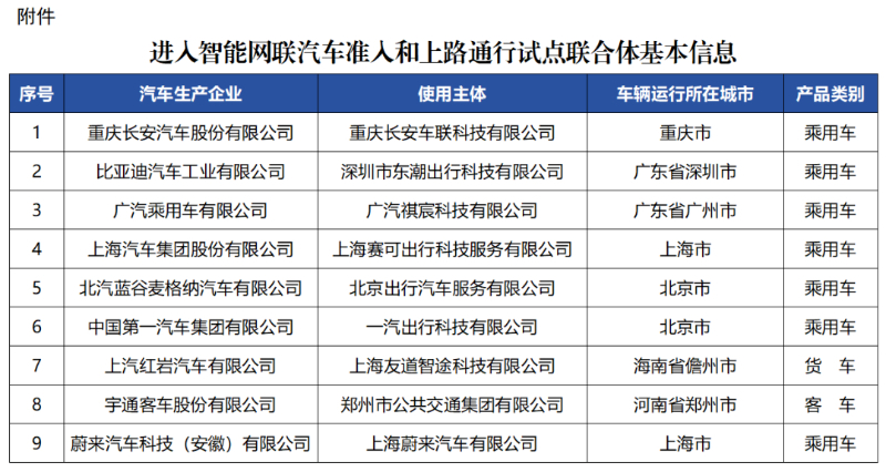 2024年6月,工信部等四部门联合发布进入首批智能网联汽车准入和上路通行试点联合体名单,有包括长安、北汽在内的9个车企。