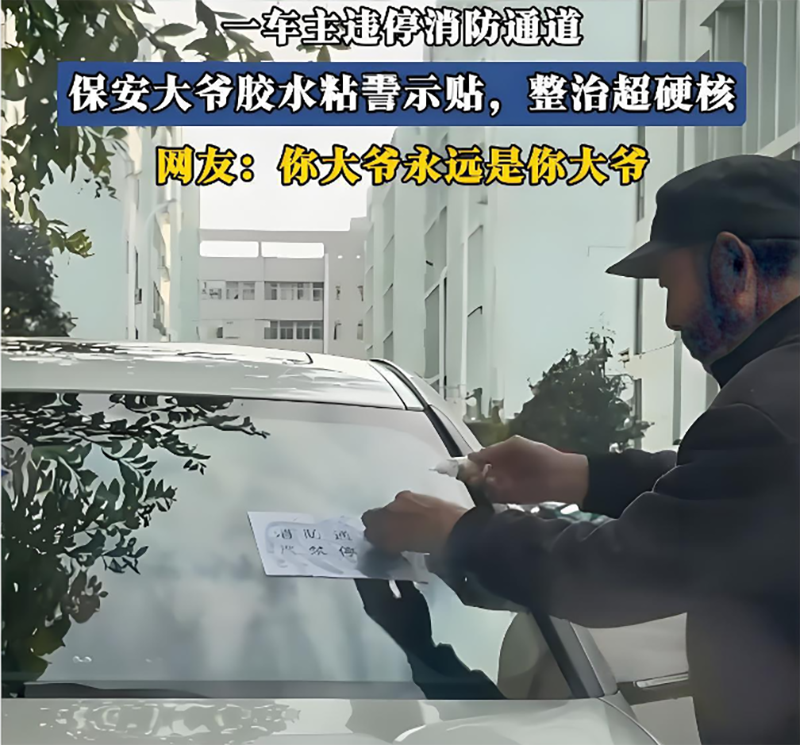 然而在诸多小区里依然能看到随意将车辆停放在消防通道区域里的汽车,面对这些违法停靠的车辆,作为小区管理方的物业是有责任去提醒的;但是资料中的这名保安的做法却有待商榷,物业方面实际没有执法权,更不能损害他人财物,而这名保安的做法却已经涉嫌损坏他人物品。