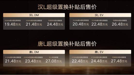 此次,汉L DM 3款车型,超级置换补贴后售价19.48万~24.48万元;汉L EV 3款车型,超级置换补贴后售价20.48万~26.48万元;唐L DM 3款车型,超级置换补贴后售价21.48万~27.08万元;唐L EV 3款车型,超级置换补贴后售价22.48万~27.48万元。