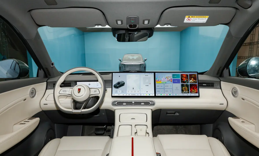 进入车内,红旗HS6 PHEV则采用全新的设计语言,简洁的仪表台由不同材质以及颜色的材料所搭配,层次感清晰,镶嵌式的窄条液晶仪表配合双15.6英寸中控+副驾娱乐屏所组成的双联屏,则将整车内部科技感抬升新高度,这也是红旗品牌首款搭配双联屏的车型,车机内置8295P芯片,操作流畅、交互智能。