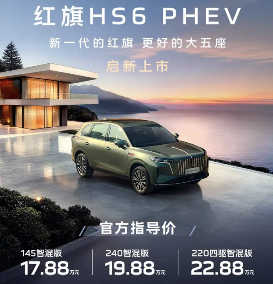 一汽红旗旗下全新中大型SUV车型——红旗HS6 PHEV于12月16日正式上市,新车共推出3款配置车型,官方指导价区间17.88万元-22.88万元。新车延续家族式的外观设计,并且换装全新内饰设计语言,搭载1.5T插混系统,纯电续航最高可达240km。