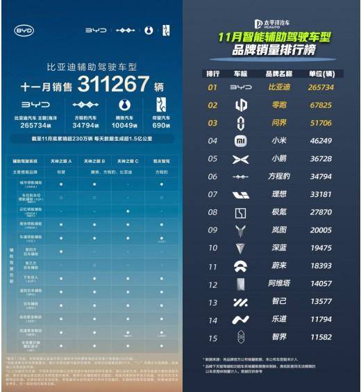 近日,比亚迪公布了其搭载天神之眼辅助驾驶系统的车型在11月的销售数据,全月销量达311267辆,继续引领市场。其中,比亚迪王朝与海洋系列贡献265734辆,方程豹、腾势、仰望等高端及个性化品牌亦表现稳健,共同构筑了比亚迪在智能驾驶领域的强大产品矩阵。