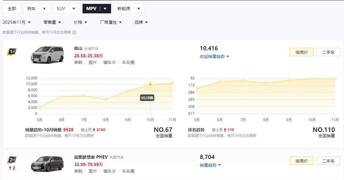 不知道大家注意到没有,在11月份的MPV销量榜中,岚图梦想家的销冠宝座居然被魏牌高山给超越掉了。从数据上来看,11月高山车系零售量10416辆,岚图梦想家PHEV零售8704辆,二者之间销量差达到1700台,魏牌高山这回算是坐稳MPV销量榜第一名的位置了。