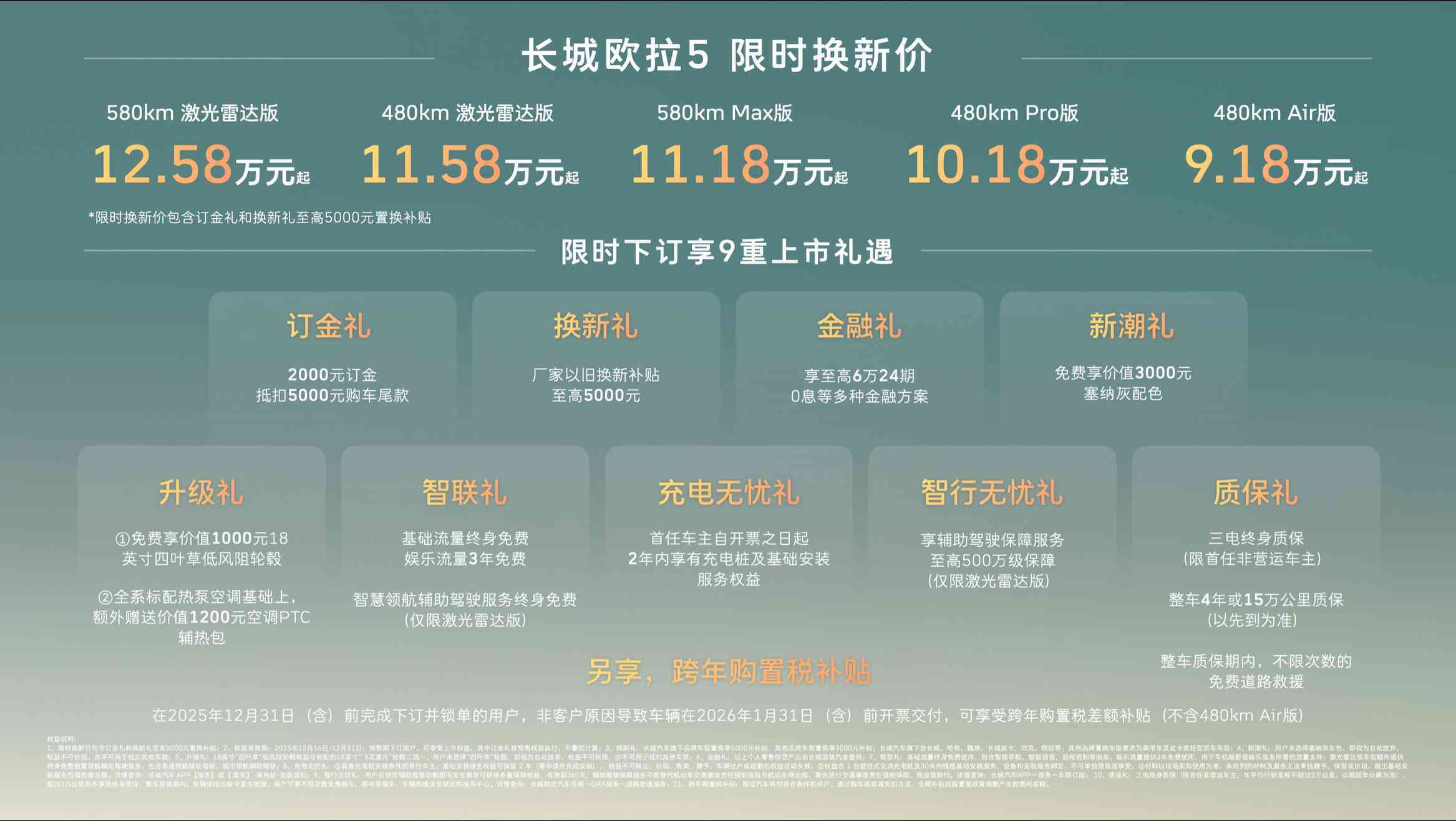 【中国·保定】2025年12月16日——今日,长城汽车欧拉品牌全新A级纯电SUV——长城欧拉5正式上市。新车共推出5款配置,建议零售价区间为 9.98万至13.38万元,限时换新价9.18万元起(限时换新价包含“订金礼”和“换新礼”至高5000元以旧换新补贴)。为回馈广大用户的热爱与支持,即日起至2025年12月31日,用户下订并锁单即可尊享包含订金礼、换新礼、智行无忧礼在内的9重上市好礼,以及跨年购置税补贴(不含480km Air版)等丰厚购车权益。凭借诚意十足的价格权益与越级产品力,长城欧拉5致力于成为全球年轻用户的“严选搭子”。