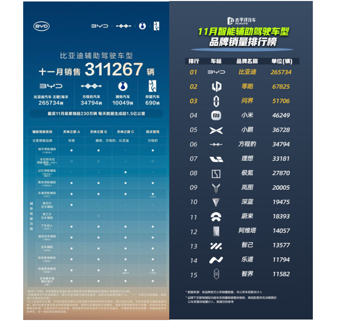 近日,比亚迪公布了其搭载天神之眼辅助驾驶系统的车型在11月的销售数据,全月销量达311267辆,继续引领市场。其中,比亚迪王朝与海洋系列贡献265734辆,方程豹、腾势、仰望等高端及个性化品牌亦表现稳健,共同构筑了比亚迪在智能驾驶领域的强大产品矩阵。
