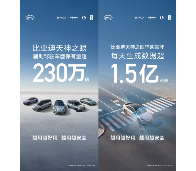 数据显示,截至2025年11月底,比亚迪搭载“天神之眼”驾驶辅助系统的车型累计销量已突破230万辆,持续蝉联中国辅助驾驶车型销量及系统装车量榜首。这标志着比亚迪推动的“全民智驾”战略已取得显著成效,智能驾驶正从高端配置加速向主流市场普及。