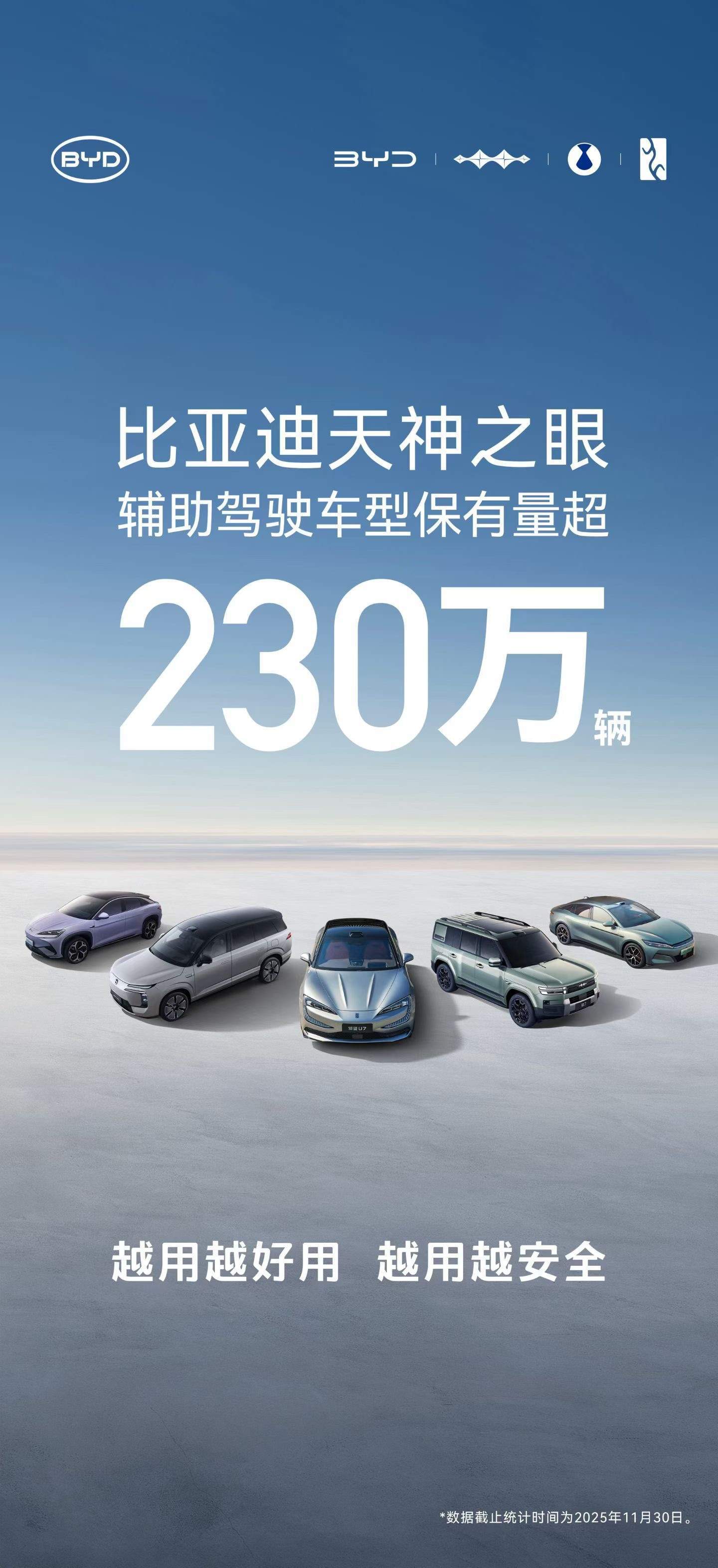 数据显示,截至2025年11月底,比亚迪搭载“天神之眼”驾驶辅助系统的车型累计销量已突破230万辆,持续蝉联中国辅助驾驶车型销量及系统装车量榜首。这标志着比亚迪推动的“全民智驾”战略已取得显著成效,智能驾驶正从高端配置加速向主流市场普及。