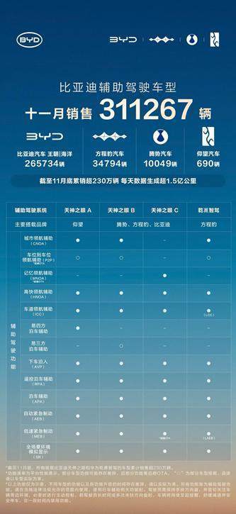 近日,比亚迪公布了其搭载天神之眼辅助驾驶系统的车型在11月的销售数据,全月销量达311267辆,继续引领市场。其中,比亚迪王朝与海洋系列贡献265734辆,方程豹、腾势、仰望等高端及个性化品牌亦表现稳健,共同构筑了比亚迪在智能驾驶领域的强大产品矩阵。