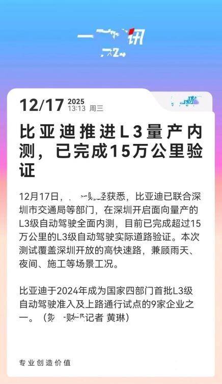 12月17日,有媒体获悉,比亚迪已联合深圳市交通局等部门,在深圳开启面向量产的L3级自动驾驶全面内测,目前已完成超过15万公里的L3级自动驾驶实际道路验证。本次测试以安全为核心,覆盖深圳开放的高快速路,兼顾雨天、夜间、施工等不同场景工况,全面验证L3级别产成熟度和可靠性,为国家L3级自动驾驶落地提供实践依据。