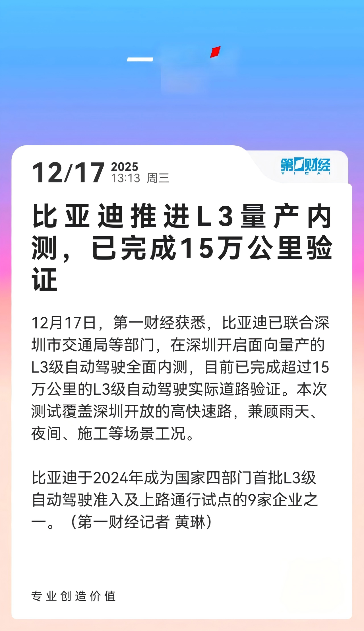 据了解,比亚迪已联合深圳市交通局等部门,在深圳开启面向量产的L3级自动驾驶全面内测,目前已完成超过15万公里的L3级自动驾驶实际道路验证。本次测试以安全为核心,覆盖深圳开放的高快速路,兼顾雨天、夜间、施工等不同场景工况,全面验证L3级产品成熟度和可靠性,为国家L3级自动驾驶落地提供实践依据。