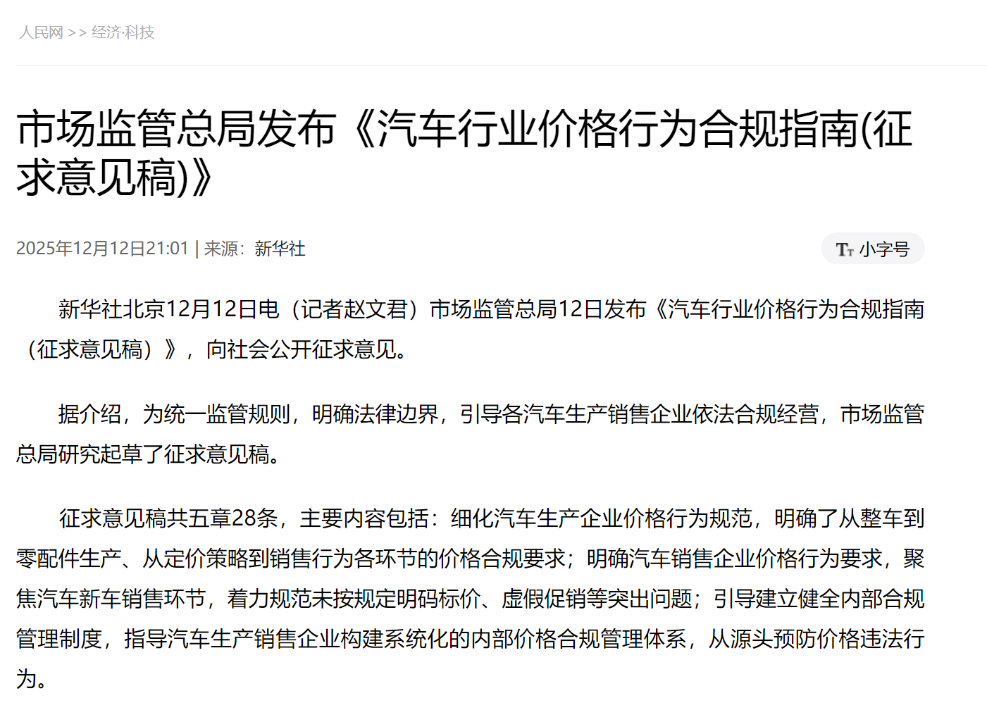 但12月12日,市场监管总局《汽车行业价格行为合规指南(征求意见稿)》剑指 “低价倾销”,明确禁止 “除清仓外以低于成本定价”,甚至要求车企建立价格合规审核机制,对厂家、商家以及配套供应商均有相关约束说明。
