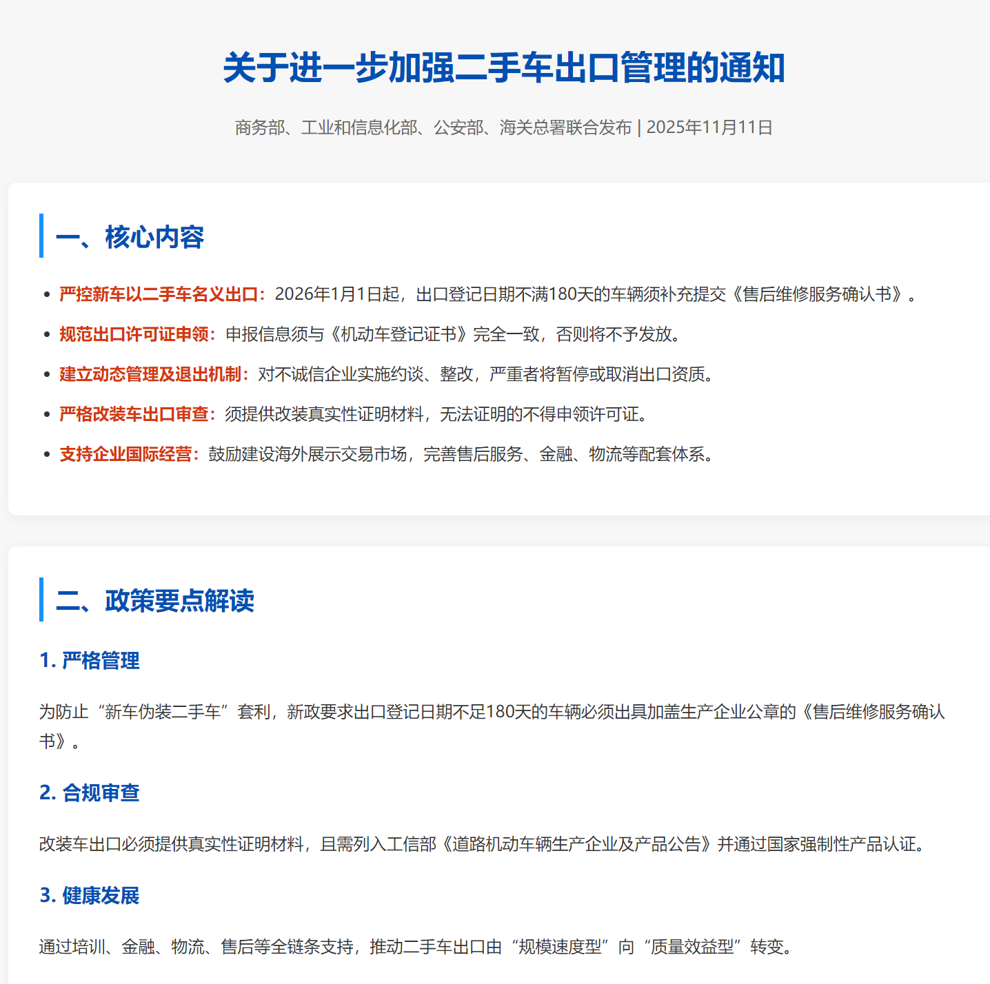 值得注意的是,一方面,海关总署联合相关部门推出了多种创新监管模式和流程简化举措,覆盖新车、二手车等不同品类,旨在缩短通关时间,降低了企业物流成本;另一方面,11 月,多部门发布的《关于进一步加强二手车出口管理工作的通知》,明确严控新车以二手车名义出口。