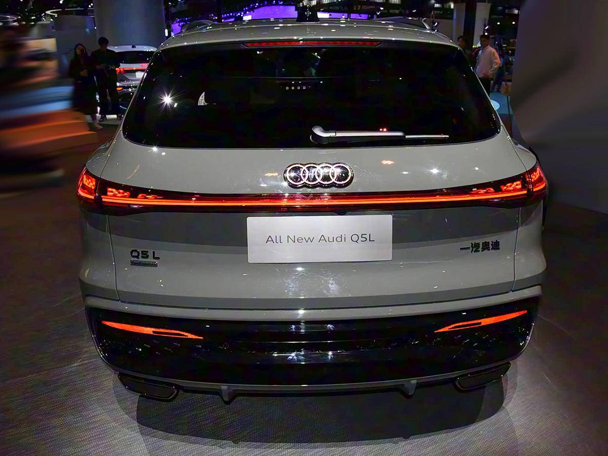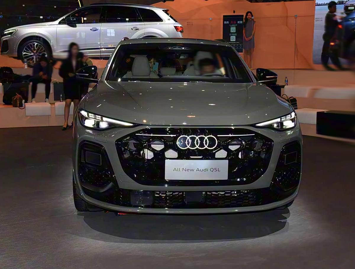 前脸部分,和新能源车常见的大面积封闭式设计不同,新款Q5L前脸使用了大面积的格栅,其中中网使用了多边形轮廓,内部是蜂窝状的黑色格栅,带有发光车标,前杠下部是横贯式的U形格栅设计。大灯内侧使用了锐角造型,视觉效果很犀利。