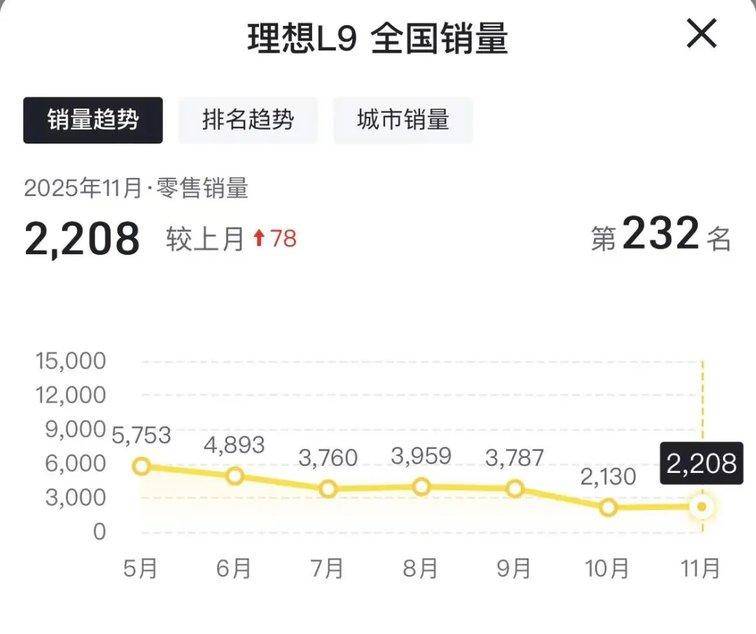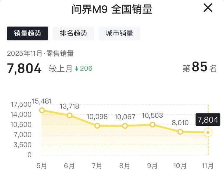 作为自主豪华新能源SUV,问界凭借与华为合作,销量提升很快,问界M9作出了巨大贡献,这个价位月销量可以做到超万辆,不过,销量高峰过后,问界M9销量也开始下滑了,11月销量7804辆,销量曲线图是下滑趋势。