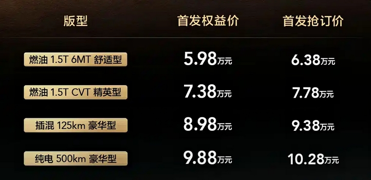 新车会提供燃油、插混、纯电三种动力形式。其中燃油版本使用1.5T发动机+6MT/CVT组合,最大功率为130kW,峰值扭矩290牛·米;插混版本搭载1.5L发动机+第四代10合1电机,带来125公里的CLTC纯电续航以及1100公里的综合续航;纯电动版车型搭载100千瓦电机+60kWh神炼电池,纯电续航达到500公里。