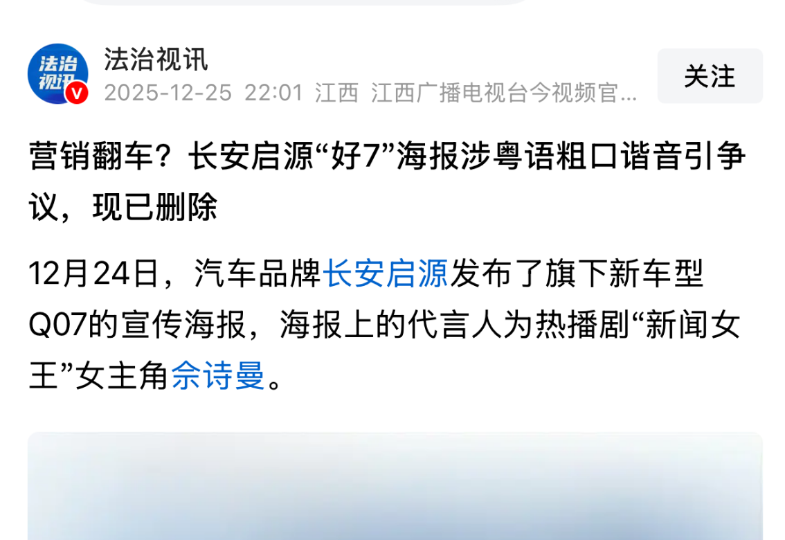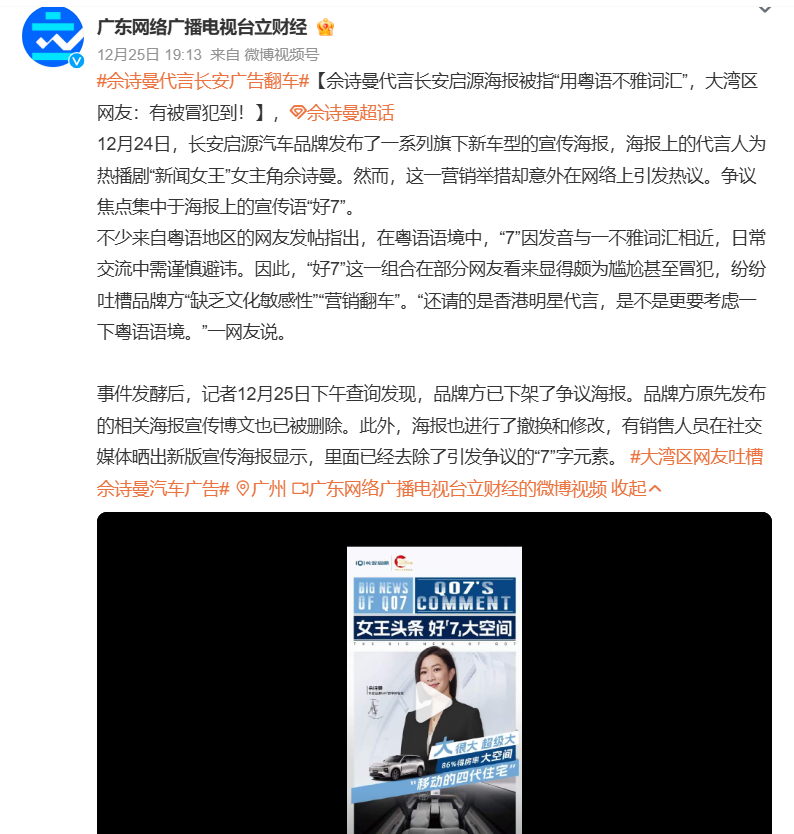 一张新车宣传海报,因为两个字的谐音,将长安启源推上了舆论的风口浪尖。12月24日,长安启源为旗下新车型Q07发布了一组宣传海报,代言人是凭借热播剧《新闻女王》再度走红的香港演员佘诗曼。然而,海报上醒目的宣传语 “好7” 并未带来预期的好评,反而在粤语文化区引发了争议。不少懂粤语的网友指出,“7”的发音在粤语中与某个粗口谐音,“好7” 组合在一起的含义极为不雅。