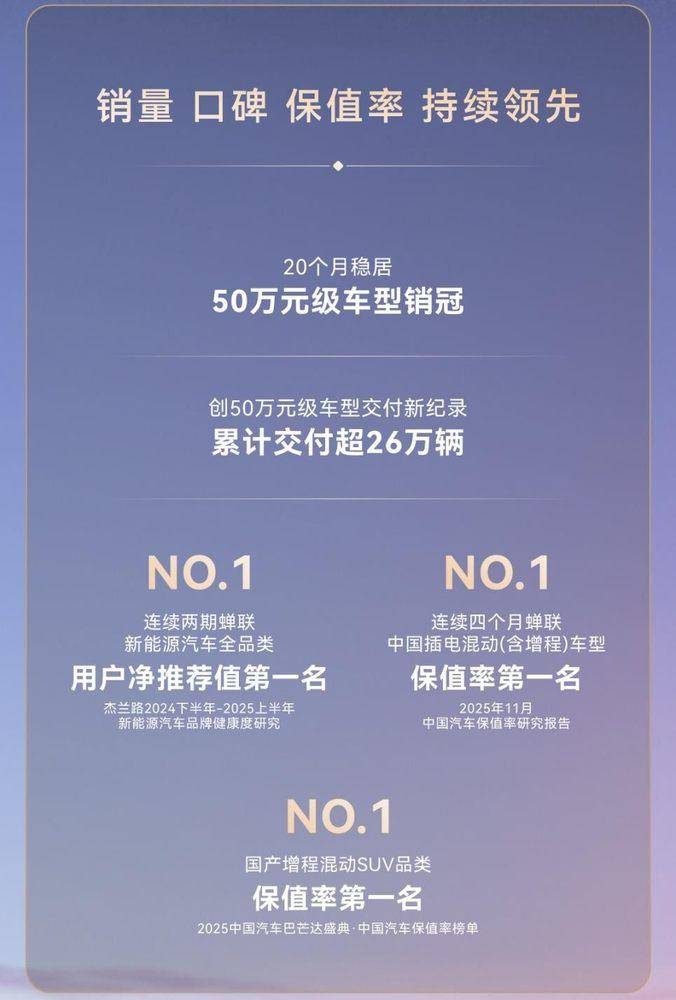 问界M9的成功,不止于销量。在中国汽车流通协会发布的《2025年11月中国汽车保值率研究报告》中,问界M9已连续四个月蝉联中国插电混动(含增程)车型保值率第一,并在2025中国汽车巴芒达盛典“中国汽车保值率榜单”中位列国产增程混动SUV第一,展现50万级豪华车价值新高度。
