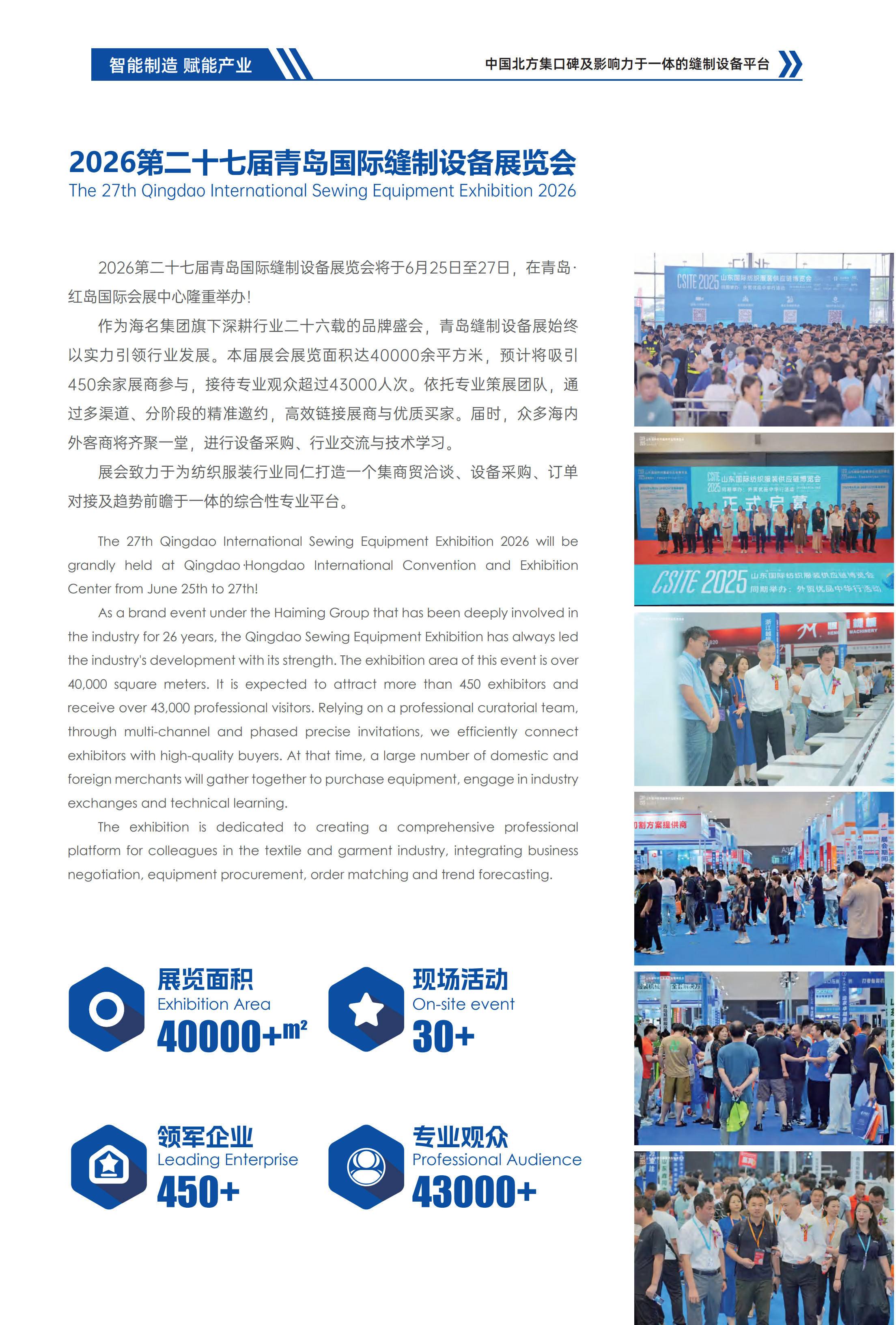 2026青岛国际缝制设备展览会(简称青岛缝制展),是中国缝制设备行业全产业链的年度盛会和全国品牌的新品首发平台。2026年展会规模再升级,100000平方米展示面积,吸引了来自全国的2000+展商共襄2026中国缝制行业盛会,预计专业观众突破85000人。