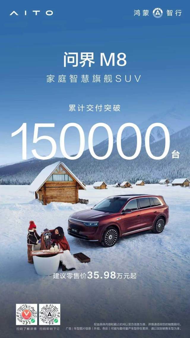 自2025年4月上市以来,问界M8持续刷新交付纪录:首月大定突破8万辆,45天交付达2万辆,200天突破12万辆,上市8个月累计交付已超15万辆。这一系列成绩的背后,源于对家庭出行场景的深刻洞察,更源自“智慧重塑豪华”理念的践行——它超越传统的符号化豪华,以价值为核心,将智能科技与舒适体验融入日常,让新豪华真正融入生活。