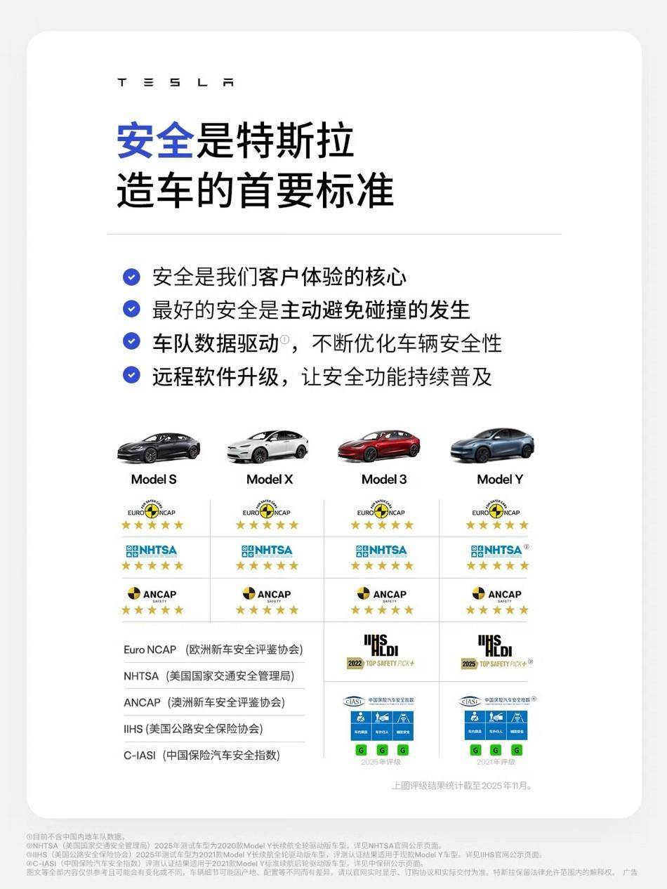 “买车就买全球车型”也成为不少消费者选择特斯拉的原因。近期,现款 Model Y 获得了2025年 Euro NCAP(欧洲新车安全评鉴协会)、ANCAP(澳洲新车安全评鉴协会)“五星安全”评级。作为全球车型,S3XY全系车型满足多个市场严苛标准,已在美国 NHTSA、欧洲 Euro NCAP、中国 C-IASI、澳大利亚 ANCAP 等多个权威机构中获得“五星安全”评级。
