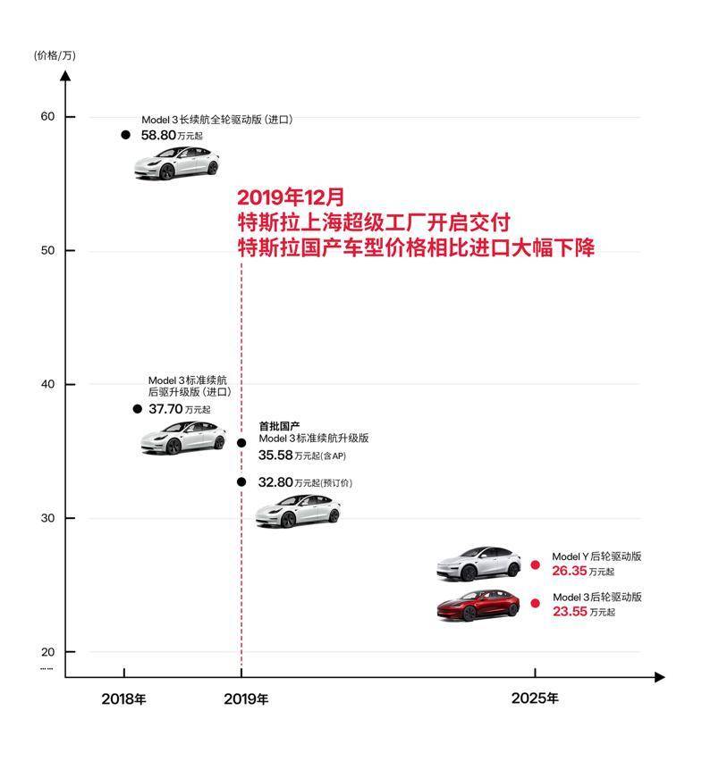 得益于上海超级工厂的高效和特斯拉的成本定价逻辑 ,Model 3和Model Y在中国大陆的售价均低于全球其他市场。自2019年上海超级工厂完成Model 3的首批交付,至2025年第400万台整车下线,6年来,消费者可以通过更好的价格购得更棒的产品。