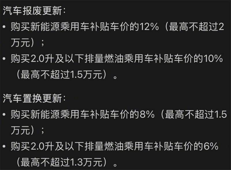 2026年“汽车国补”政策新鲜出炉,仍然支持报废更新和置换更新,不过不同的是,补贴金额从原本固定的金额,调整为新车价格按比例补贴,比如原本报废旧车购买新能源车/油车的消费者,统一补贴2万元/1.5万元,但是2026年的补贴金额为新车售价的12%(2万元封顶),以及10%(1.5万元封顶);如果是置换补贴,新能源车和油车的补贴比例分别是8%和6%,补贴金额上限分别为1.5万元和1.3万元。