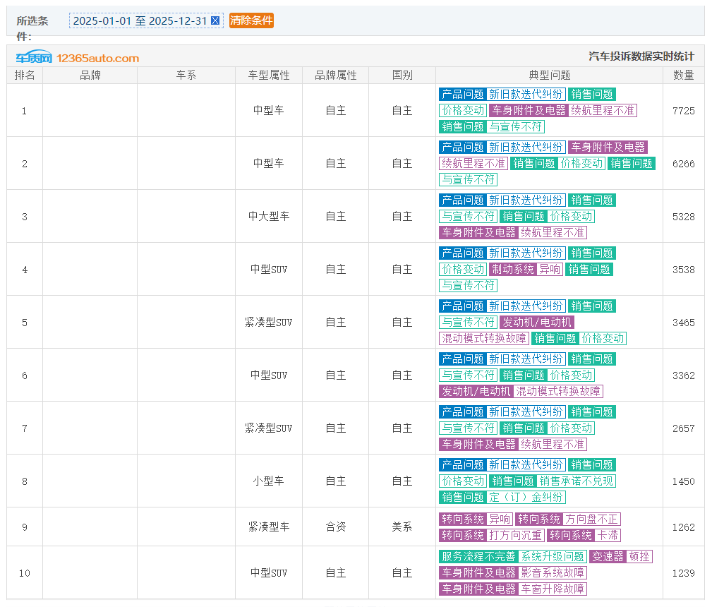 由全国汽车消费者投诉受理处置服务平台(车质网)统计公示的资料,已有2025年全年典型问题投诉排名。