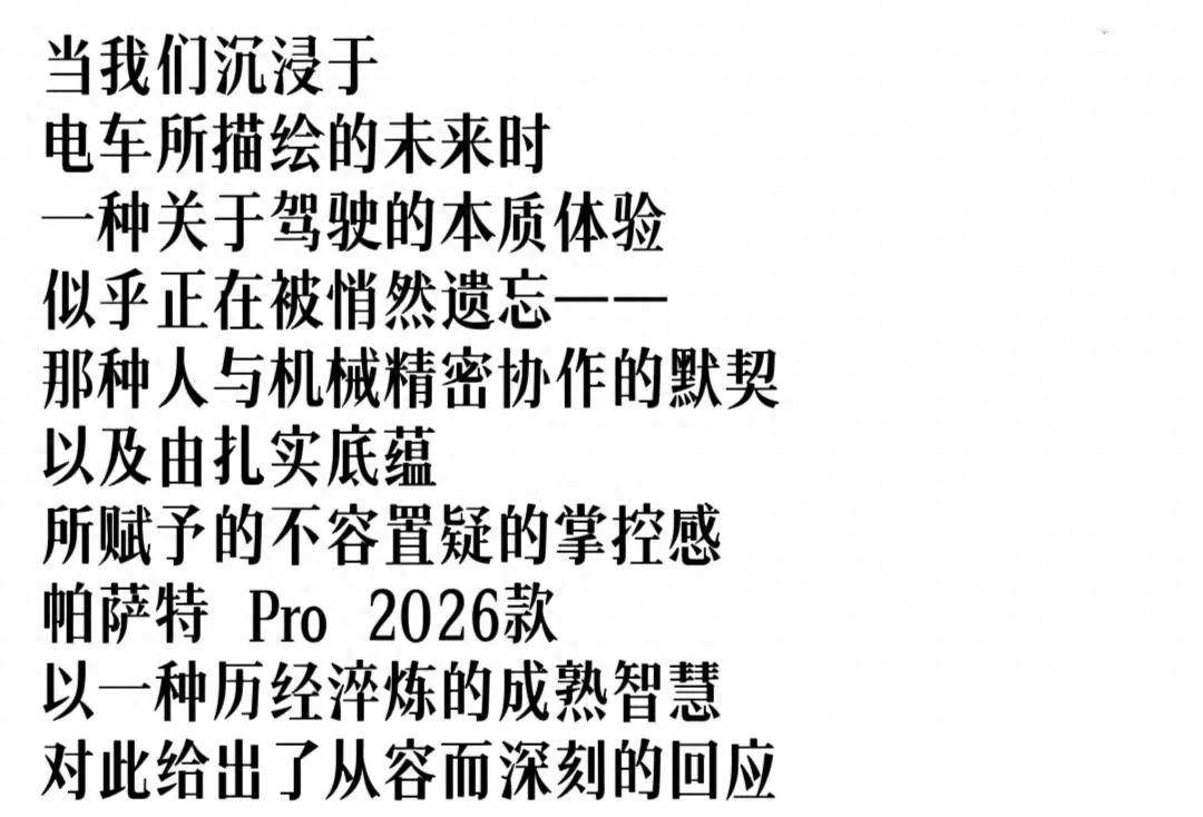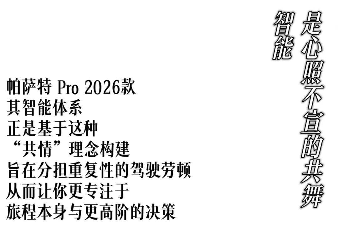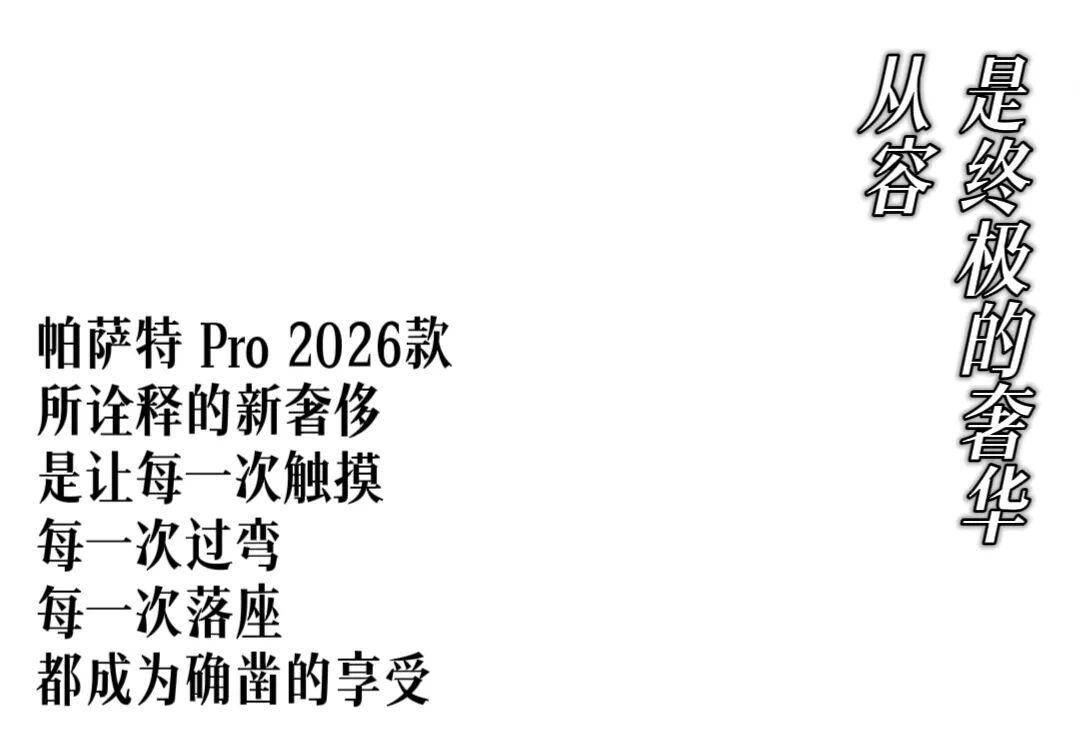 帕萨特 Pro 2026款,通过 “形”之表达、“智”之共情、“体”之从容 的三重升华,完成了一次对品质生活的深度诠释。它告诉我们:真正的时代新奢,不是对未来空泛的想象,而是在历经淬炼的扎实底蕴上,生长出丰盈现实生活的智慧。