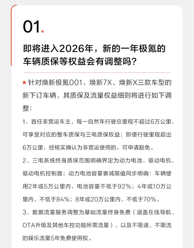 临近2026年,新能源行业的竞争再度升级。近日,极氪在《极氪零距离》中提前披露新一年质保及流量等核心用户权益方案,没有藏着掖着的套路,只有清晰透明的细则与切实可行的保障。此次调整看似是规则优化,实则是极氪对用户需求的深度洞察,更以高于法规、优于行业的底气,展现了用户型企业的责任与担当。