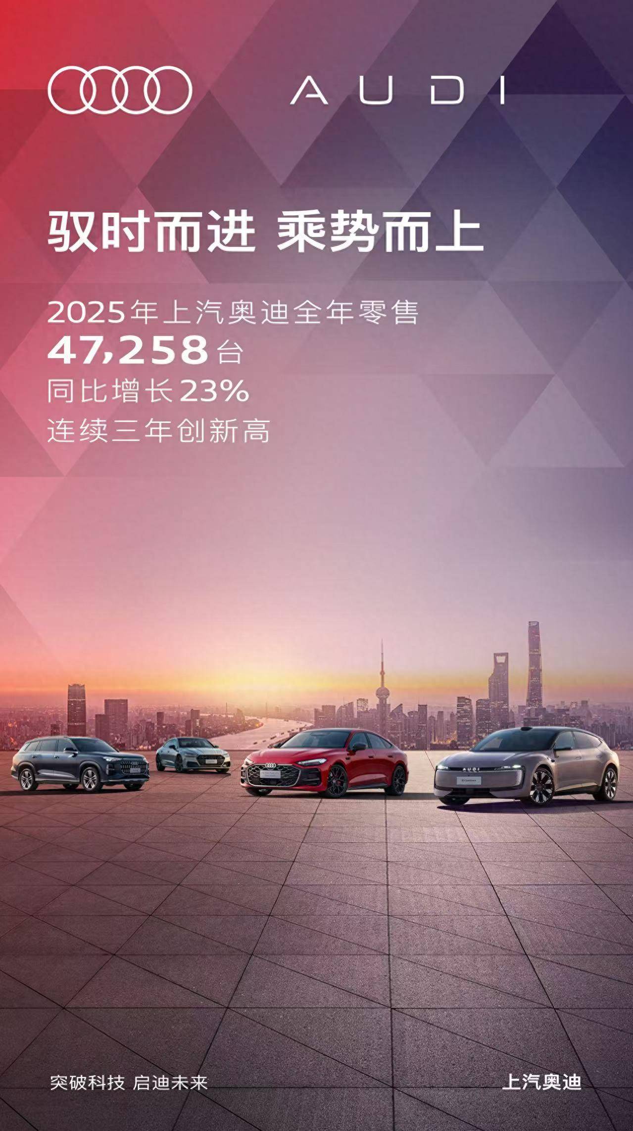 上汽奥迪2025年全年零售达47,258台,同比增长23%,实现年度销量稳健三连涨,展现出强劲的市场发展势能。持续向好的增长态势,得益于产品矩阵的高效焕新与精准布局。2025年,上汽奥迪接连推出两款重磅新车,全新上汽奥迪A5L Sportback作为全球首款搭载华为乾崑技术的燃油车,率先开启智能豪华燃油车新赛道;奥迪 E5 Sportback则深度融合德系豪华基因与中国智能科技,为追求高品质电动出行的用户带来全新选择。