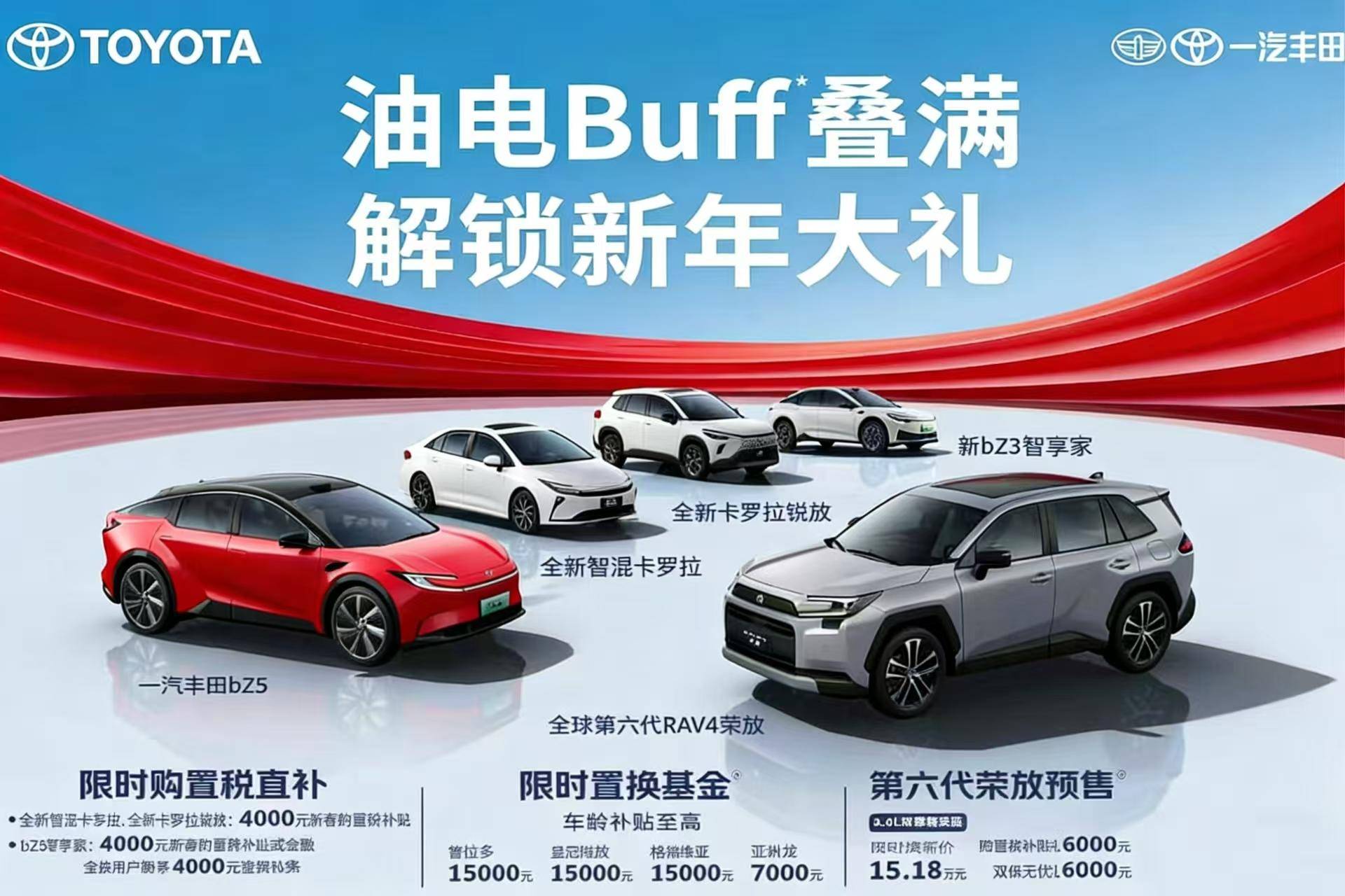 为了回馈广大用户的厚爱,开年之际,一汽丰田就推出了重磅福利。2026年1月1日-1月9日,全新智混卡罗拉、全新卡罗拉锐放、bZ3 智享家、bZ5可享4000元新春购置税补贴,其中bZ5置换用户额外享 4000 元置换补贴;普拉多、皇冠陆放、格瑞维亚等车型限时置换补贴至高 1.5 万元;第六代全新荣放2.0L 双擎精英版限时焕新价15.18万元,此外全系版本还可享购置税补贴礼及双保无忧礼各 6000 元。