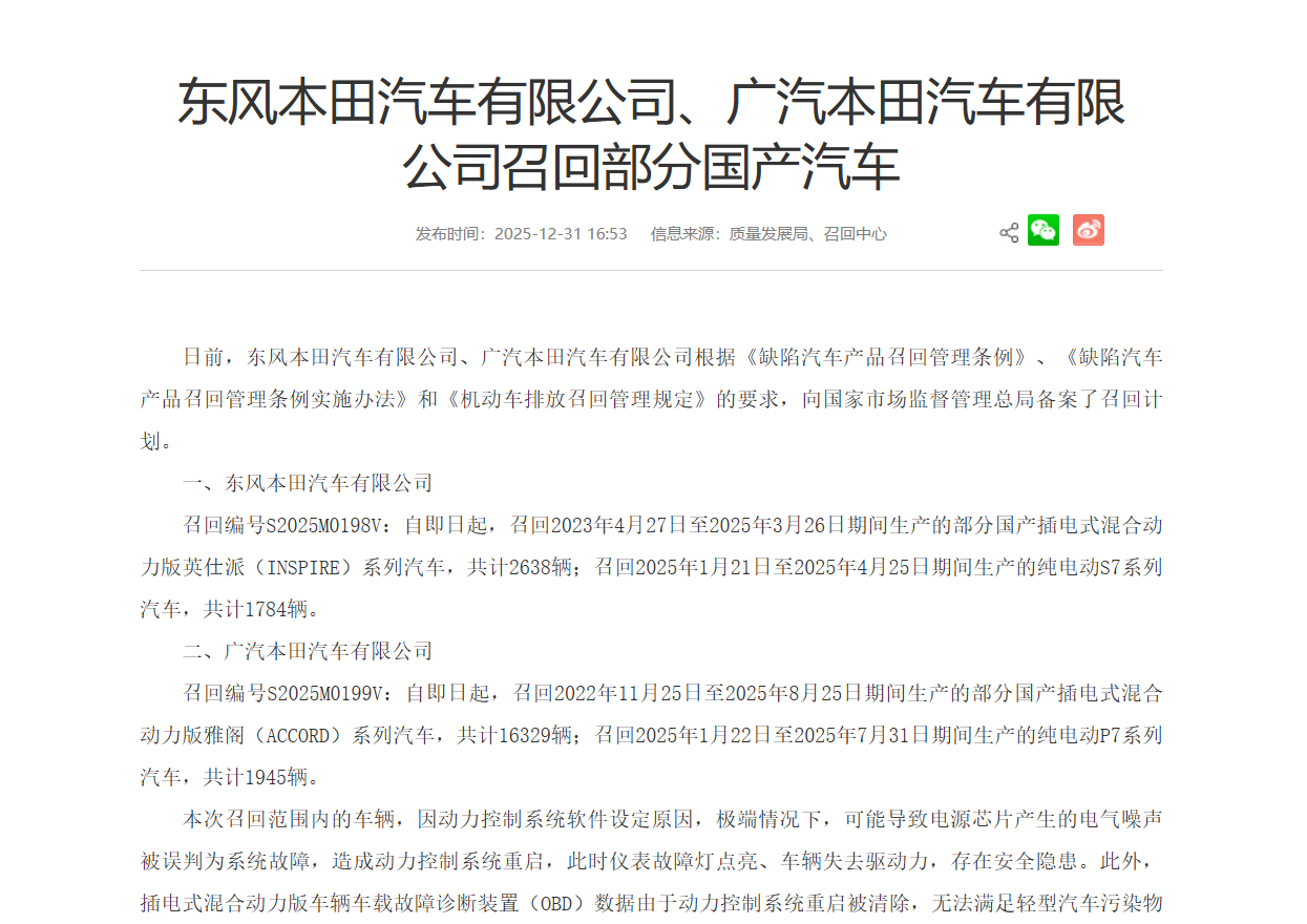 国家市场监督管理总局近日发布的一则召回公告,将东风本田推向了公众视野的中心。公告显示,东风本田将召回两款关键新能源车型:生产于2023年4月至2025年3月的插电式混合动力英仕派,以及生产于2025年1月至4月的纯电动S7系列,总计超过4400辆汽车面临潜在风险。