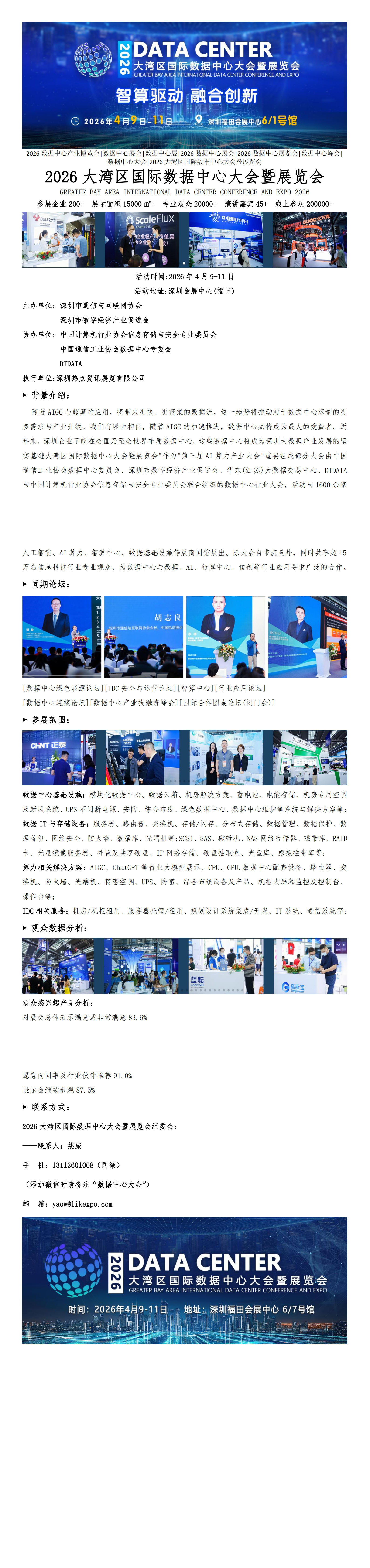 随着AIGC与超算的应用,将来更快、更密集的数据流,这一趋势将推动对于数据中心容量的更多需求与产业升级。我们有理由相信,随着AIGC的加速推进,数据中心必将成为最大的受益者。近年来,深圳企业不断在全国乃至全世界布局数据中心,这些数据中心将成为深圳大数据产业发展的坚实基础大湾区国际数据中心大会暨展览会"作为"第三届AI算力产业大会"重要组成部分大会由中国通信工业协会数据中心委员会、深圳市数字经济产业促进会、华东(江苏)大数据交易中心、DTDATA与中国计算机行业协会信息存储与安全专业委员会联合组织的数据中心行业大会,活动与1600余家人工智能、AI算力、智算中心、数据基础设施等展商同馆展出。除大会自带流量外,同时共享超15万名信息科技行业专业观众,为数据中心与数据、AI、智算中心、信创等行业应用寻求广泛的合作。