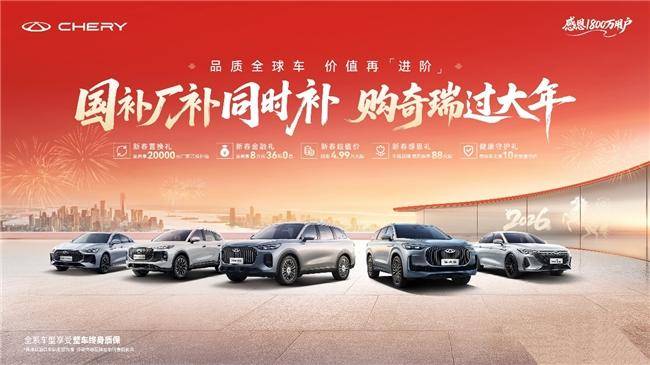 元旦假期已至,2026年新年正适合开新车。同时,新一年的国补也已如期而至,报废旧车并购置2.0升及以下排量燃油乘用车,可享车价10%补贴,至高1.5万元;置换购车并选择2.0升及以下排量燃油车型,可享车价6%补贴,至高1.3万元,利好中小排量经济型车型,正是选购1.6T冠军动力的第五代瑞虎8的好时机。在新年来临之际,奇瑞特别推出感恩全球1800万用户的 “国补厂补同时补 购奇瑞过大年”新春特别活动,至高1.5万元的国补叠加至高2万元的厂补,选购第五代瑞虎8至高补贴3.5万元,还有至高8万元36期0息、终身免费质保等福利,助力大家用最划算的价格,把第五代瑞虎8开回家过新年!