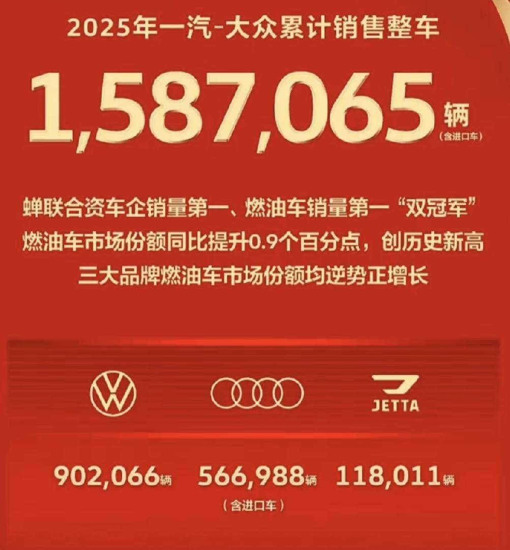 一汽-大众2025年销量1587065辆(含奥迪进口车),其中大众品牌902066辆,奥迪品牌(含进口车)566988辆,捷达品牌118011辆。在新能源渗透率持续走高的背景下,一汽-大众不仅蝉联合资车企销量第一,更夺得国内燃油车销量冠军。其燃油车市场份额逆势同比增长0.9个百分点,创下历史新高。作为企业核心支柱的大众品牌,燃油车市占率亦同比提升0.6个百分点,位列国内燃油车市场第一阵营。