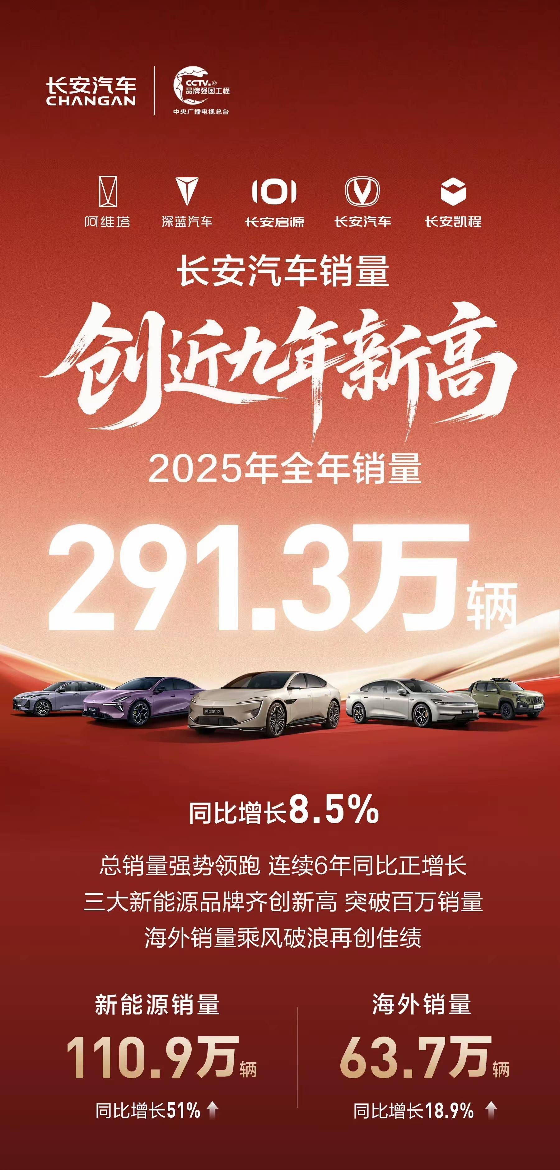 长安汽车全年累计销量达291.3万辆,同比增长8.5%,创下近九年以来的销量新高。其中,新能源汽车销量110.9万辆,同比劲增51%;海外市场销量63.7万辆,同比增长18.9%,两大核心业务板块表现亮眼,彰显出企业在新能源转型与全球化布局中的强劲势能。