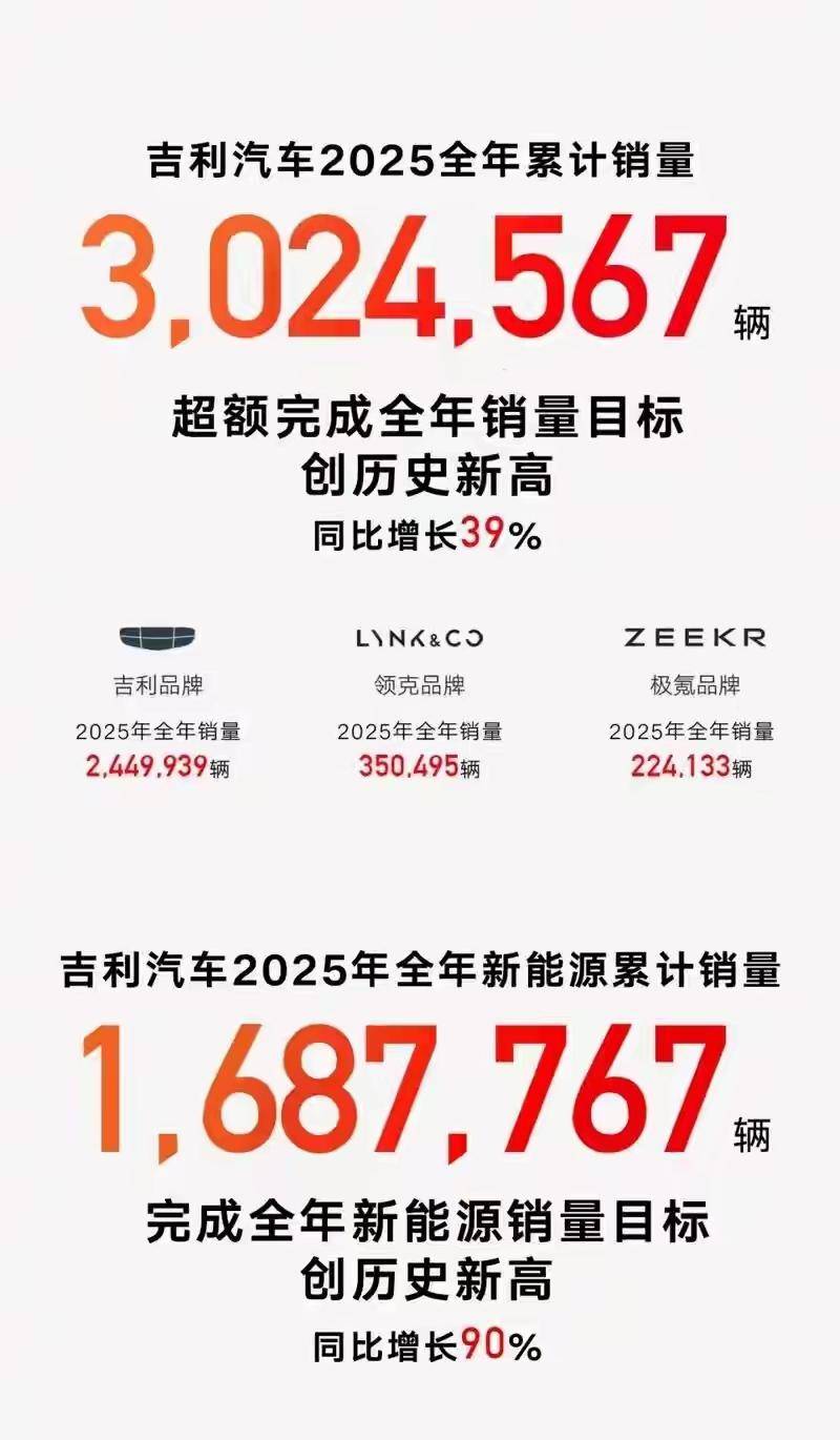 吉利汽车全年销量超302万辆,2026年销量目标345万辆