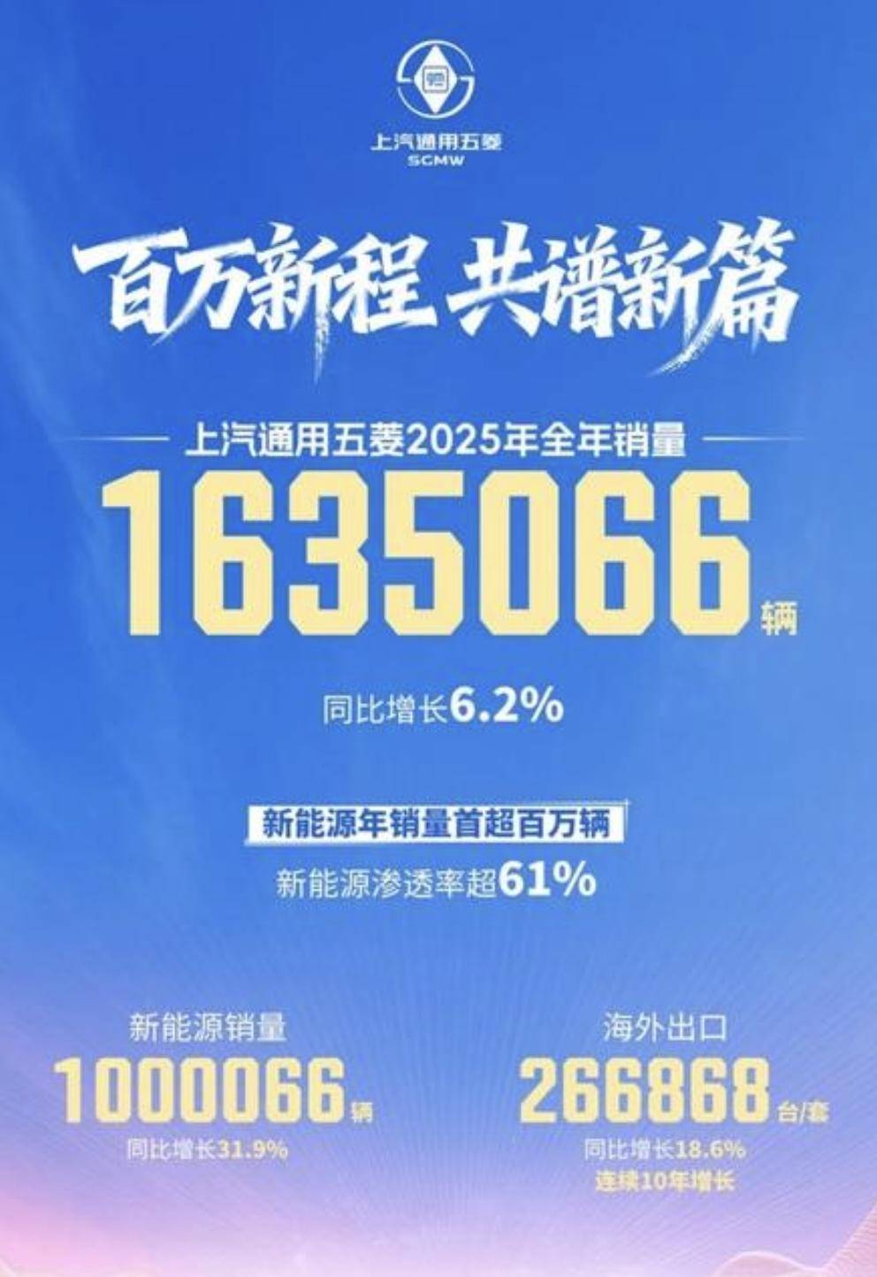 上汽通用五菱2025年全年销量1635066辆,同比增长6.2%;其中,新能源汽车年销量1000066辆,年度首次突破百万大关,同比劲增31.9%,增速稳居行业第一梯队。海外年度出口266868台/套,同比增长18.6%,已保持连续十年增长,成为民族汽车品牌“走出去”的发展典范。
