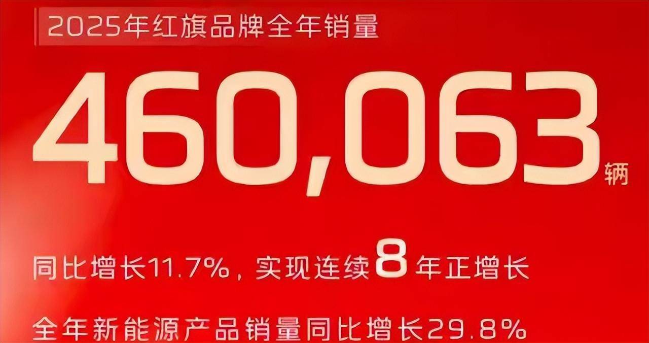 2025年,红旗品牌全年销量突破460063辆,同比增长11.7%,实现连续8年正增长。其中,红旗新能源产品全年累计销量14.9万辆,同比增长29.8%,持续担当销量增长核心动能。红旗金葵花产品销量1404辆。