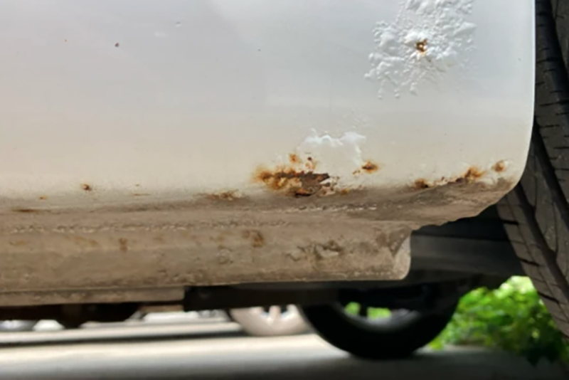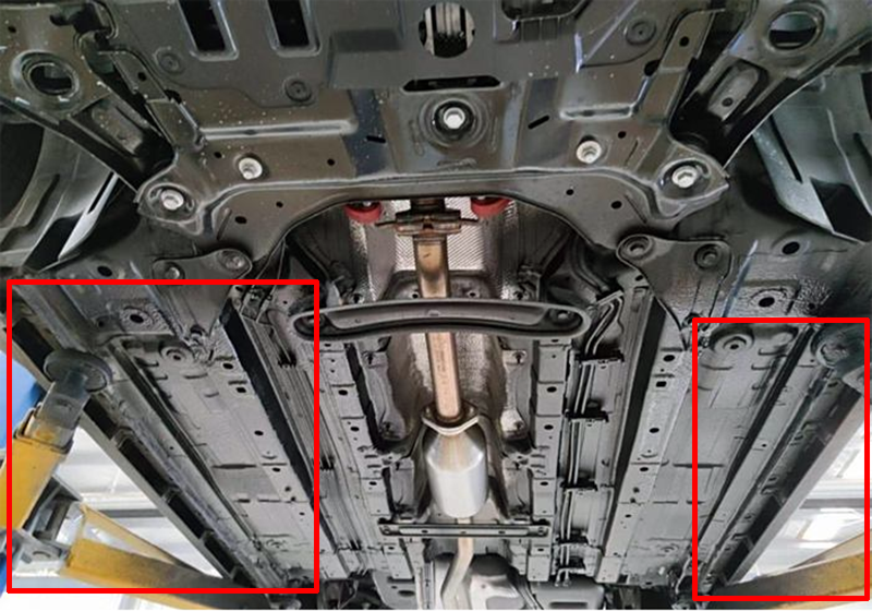 底盘两侧凸起的钢板俗称底盘裙边,前轮高速转动时会把大量雪泥甩进这一位置,也会飞溅到车门的下方;所以这一位置是比较容易锈穿的,如果雪后在雪泥里行驶但没有及时刷车并清理底盘的话,一个冬天就能让底盘出现相当程度的锈蚀。