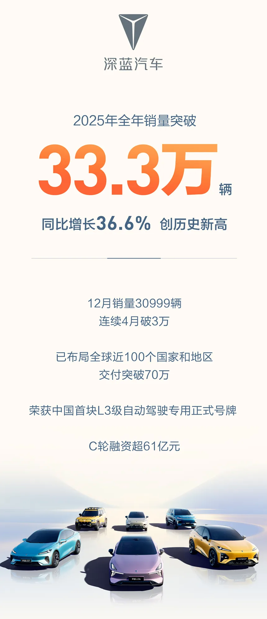 深蓝汽车2025年全年销量突破33.3万辆,同比增长36.6%,创历史新高。其中,12月销量30999辆,连续4月破3万。截至目前,深蓝汽车已布局全球近100个国家和地区,交付突破70万。