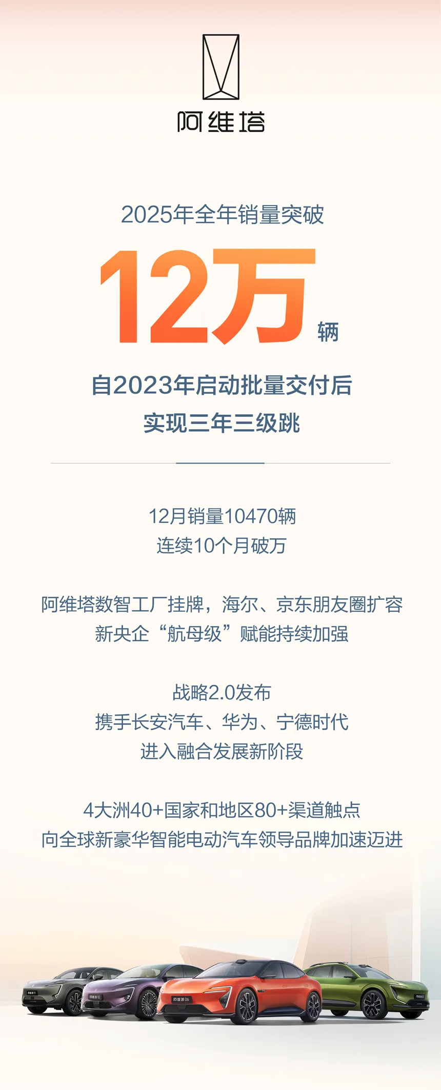 其中,阿维塔2025年全年销量突破12万辆,自2023年启动批量交付后实现三年三级跳。其中,12月销量10470辆,已连续10个月破万。面向2026年及未来,阿维塔将向全球新豪华智能电动汽车领导品牌加速迈进。