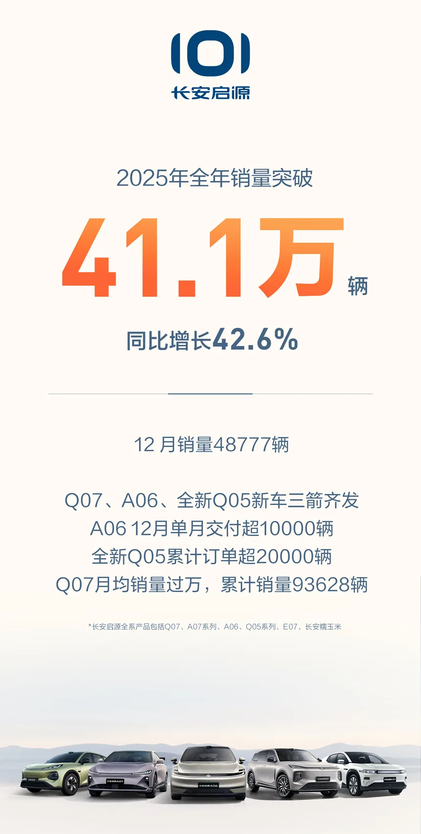 长安启源2025年全年销量突破41.1万辆,同比增长42.6%,强势崛起。其中,A06 12月单月交付超1万辆,全新Q05累计订单超2万辆,Q07月均销量过万,累计销量93628辆,成功推动领先新能源技术普惠化。